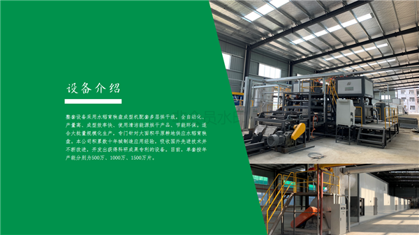 整套設備采用水稻育秧盤成型機配套多層烘干線,全自動化、產(chǎn)量高、成型效率快、使用清潔能源烘干產(chǎn)品、節(jié)能環(huán)保。適合大批量規(guī)模化生產(chǎn),專門針對大面積平原耕地供應水稻育秧盤。本公司積累數(shù)十年械制造應用經(jīng)驗,吸收國外先進技術并不斷改進,目前,單臺按年產(chǎn)量分別為500萬及1000萬片。