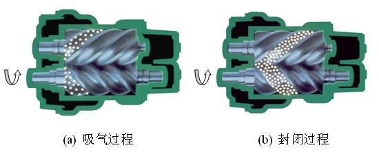 螺桿式空氣壓縮機(jī)的工作原理:電機(jī)驅(qū)動(dòng)轉(zhuǎn)子,主從轉(zhuǎn)子的齒溝空間在轉(zhuǎn)至進(jìn)氣端壁開口時(shí),其空間大,外界的空氣充滿其中,當(dāng)轉(zhuǎn)子的進(jìn)氣側(cè)端面轉(zhuǎn)離了殼之進(jìn)氣口時(shí),在齒溝間的空氣被封閉在主、從轉(zhuǎn)子與機(jī)殼之間,完成吸氣過(guò)程。在吸氣結(jié)束時(shí),主、從轉(zhuǎn)子齒峰與機(jī)殼形成的封閉容積隨著轉(zhuǎn)子角度的變化而減少,并按螺旋狀移動(dòng),此為壓縮過(guò)程。在輸送過(guò)程中,容積不斷減少,氣體不斷被壓縮,壓力提高,溫度升高,同時(shí),因氣壓差而變成霧狀的潤(rùn)滑油被噴入壓縮腔,從而達(dá)到壓縮、降低溫度密封和潤(rùn)滑的作用。當(dāng)轉(zhuǎn)子之封閉齒峰旋轉(zhuǎn)到與機(jī)殼排氣口相遇時(shí),被壓縮的空氣開始排放,直到齒峰與齒溝的吻合面移至排氣端面,此時(shí)齒溝空間為零,即完成排氣過(guò)程。與此同時(shí),主從轉(zhuǎn)子的另一對(duì)齒溝已旋轉(zhuǎn)至進(jìn)氣端,形成大空間,開始吸氣過(guò)程,由此開始一個(gè)新的壓縮循環(huán)。